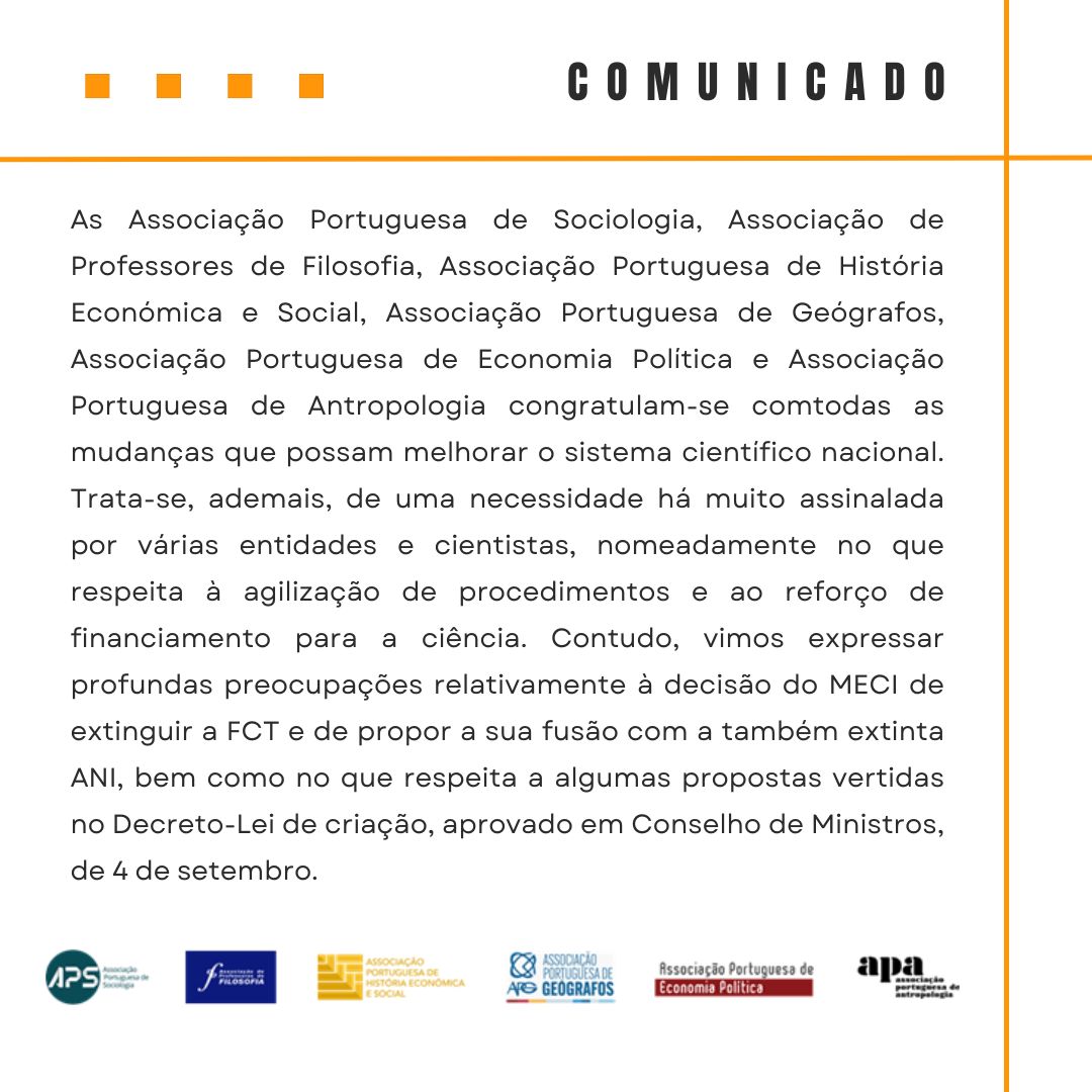 COMUNICADO Posição da APS, APF, APHES, APG, APEP e APA relativamente ao processo de extinção da Fundação para a Ciência e a Tecnologia (FCT) e a sua fusão com a Agência Nacional de Inovação [...]