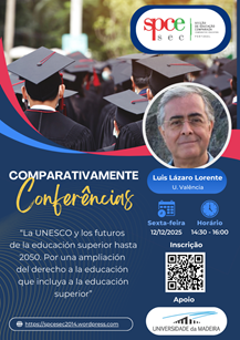 A Secção de Educação Comparada da Sociedade Portuguesa de Ciências da Educação convida todos os interessados a participarem no 5.º Comparativamente com a conferência do Professor Luis Lázaro Lorente da Universidade de Valência (Espanha), com o título “La UNESCO y los futuros de la educacional superior hasta 2050. Por una ampliación Del derecho a la educación que incluya a la educación superior”, a realizar-se no dia 12 de dezembro de 2025 no Auditório da Reitoria da Universidade da Madeira.