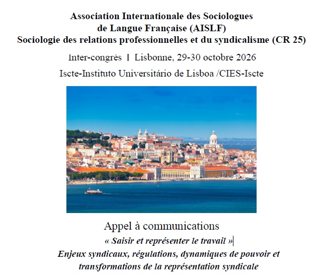 Isabel Rebelo2026-03-04T11:43:27+00:00Call for Papers até 29 de março 2026 [nova data] O Centro de Investigação e Estudos de Sociologia (CIES-Iscte) do Iscte - Instituto Universitário de Lisboa acolhe nos dias 29 e 30 de outubro de 2026 acolhe o encontro internacional da Associação Internacional de Sociólogos de Língua Francesa, dedicada ao tema "Saisir et représenter le travail". Neste [...]