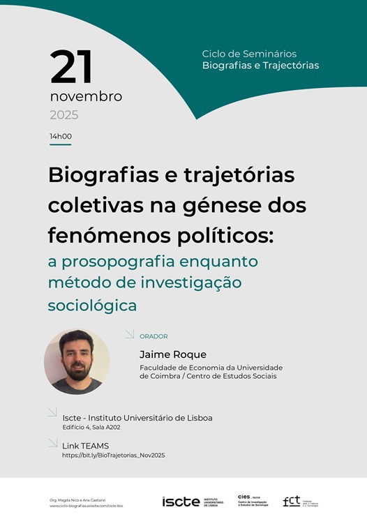 A sessão decorrerá dia 21 de Novembro, às 14h, em formato híbrido ( Iscte, sala A202 (edifício 4) e pelo Link Teams: https://bit.ly/BioTrajetorias_Nov2025