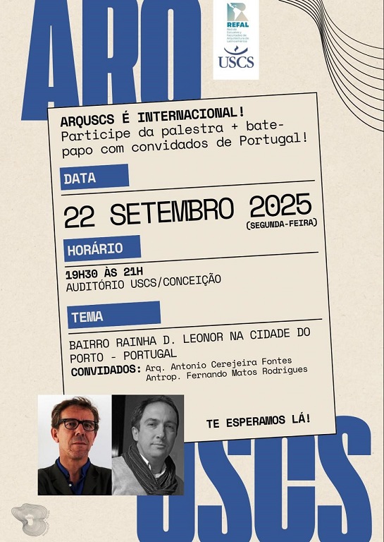 No próximo dia 22 de setembro de 2025, entre as 19H30 e as 21H00, Fernando Matos Rodrigues, antropólogo e investigador CICS.NOVA.UMinho, e António Cerejeira Fontes, arquiteto, participarão na iniciativa “ARQUSCS INTERNACIONAL”, desenvolvida pela Universidade de São Caetano do Sul, no Brasil. Este é um espaço de diálogo e partilha de conhecimento sobre arquitetura, urbanismo e sociedade, num contexto internacional.