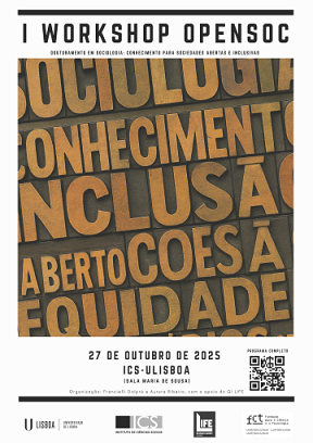 No dia 27 de outubro, terá lugar no ICS-ULisboa o I Workshop Opensoc, um encontro de estudantes do programa de Doutoramento em Sociologia: Conhecimento para Sociedades Abertas e Inclusivas. A partir das 10h, na Sala Maria de Sousa.