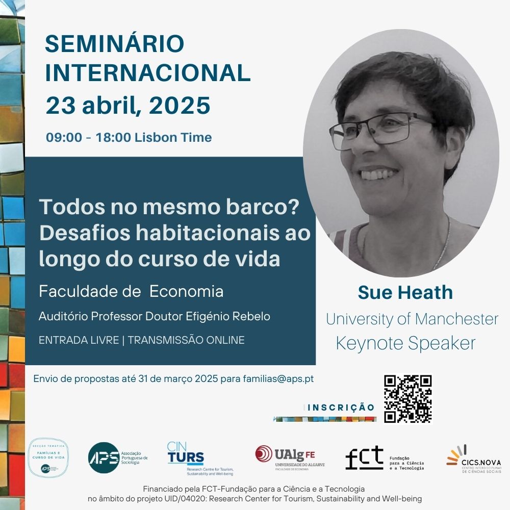 A Secção Temática Famílias e Curso de Vida da Associação Portuguesa de Sociologia, a Faculdade de Economia da Universidade do Algarve e o CICS.NOVA – Centro Interdisciplinar de Ciências Sociais coorganizam o Seminário Internacional “Todos no mesmo barco?” Desafios Habitacionais ao Longo do Curso de Vida / “All in the same boat?” Housing Challenges Over the Lifecourse, que terá lugar no próximo dia 23 de abril, no Auditório Professor Efigénio Rebelo, na Faculdade de Economia da Universidade do Algarve.
